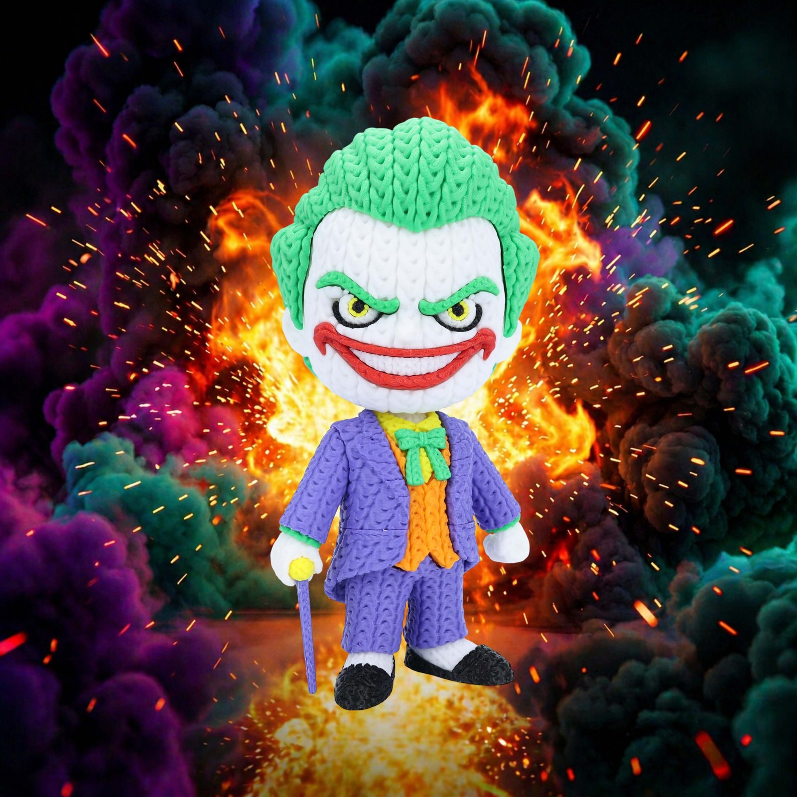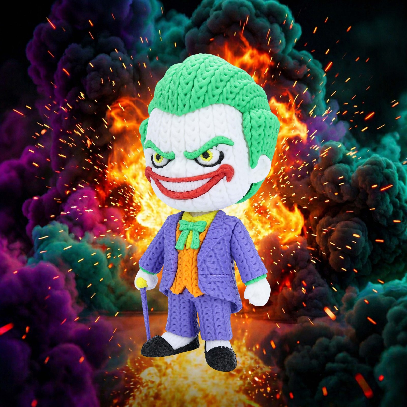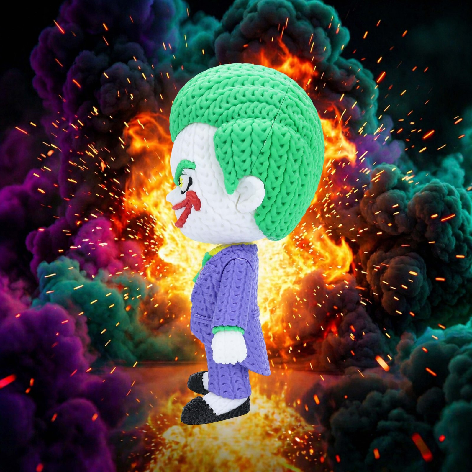 Add a little chaos to your collection with this 8-inch 3D printed Joker figure featuring a unique knitted/crochet-style texture. With a swivel head for adjustable posing, it’s a bold and eye-catching display piece for any comic fan.