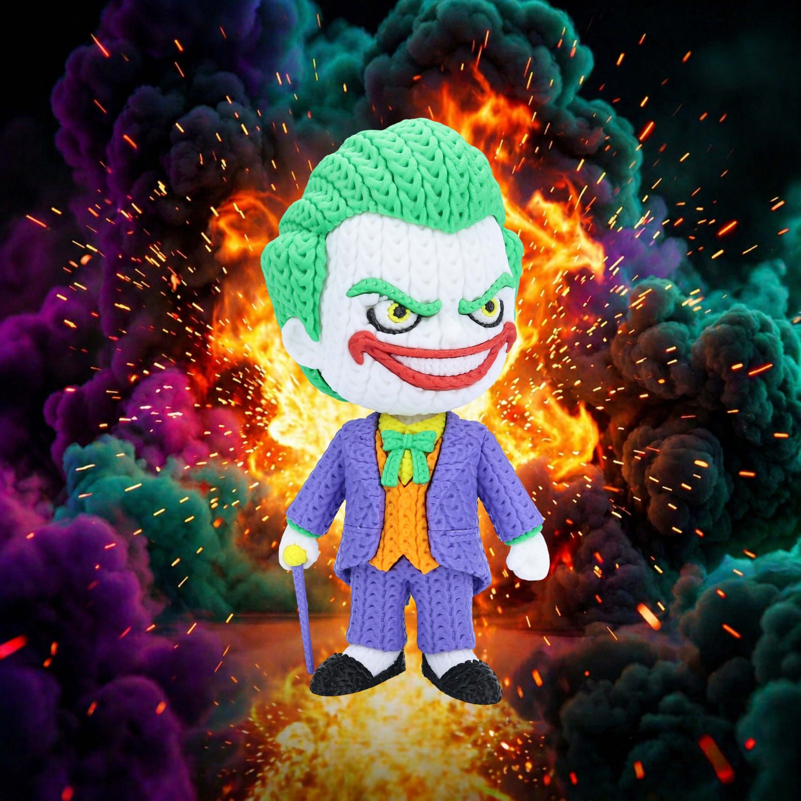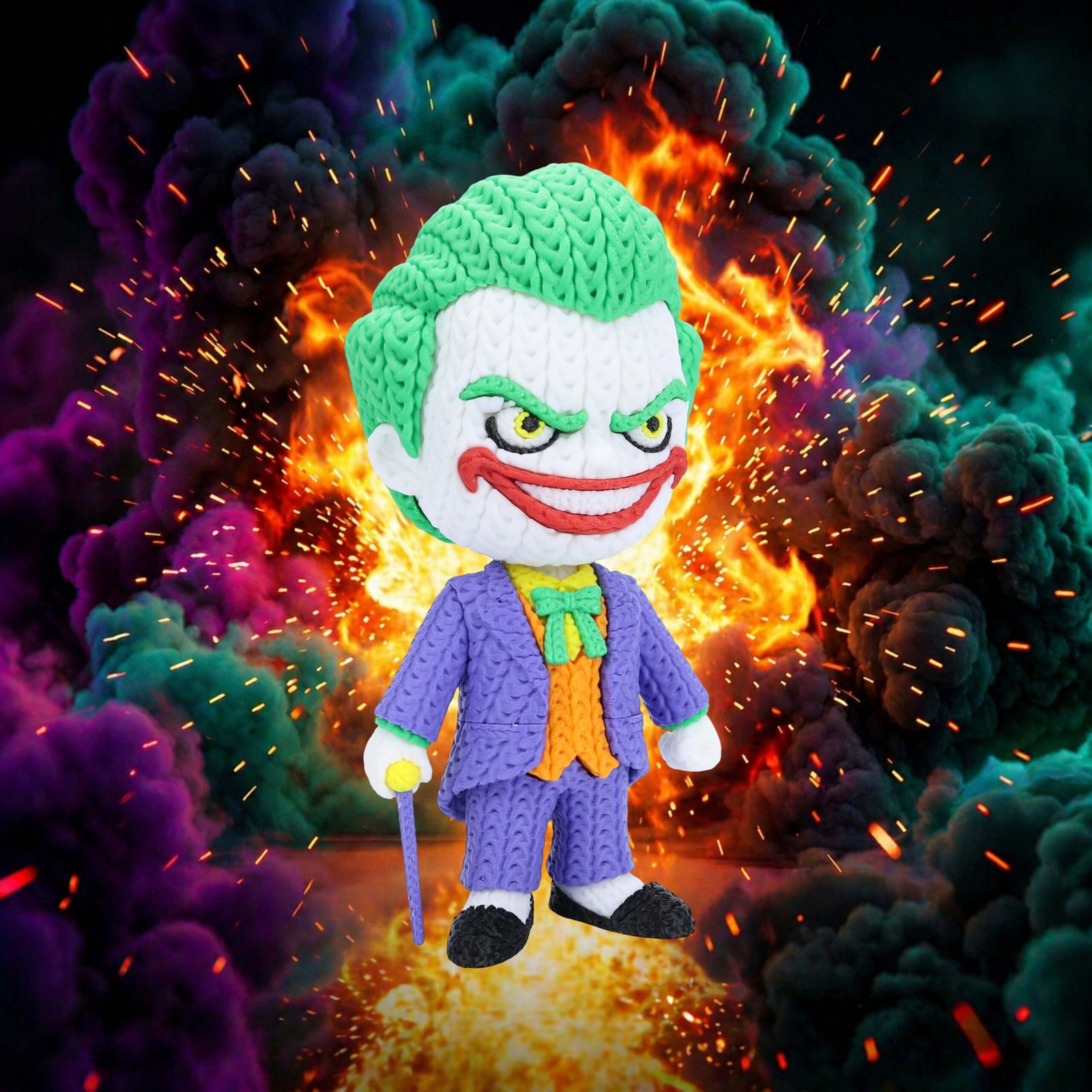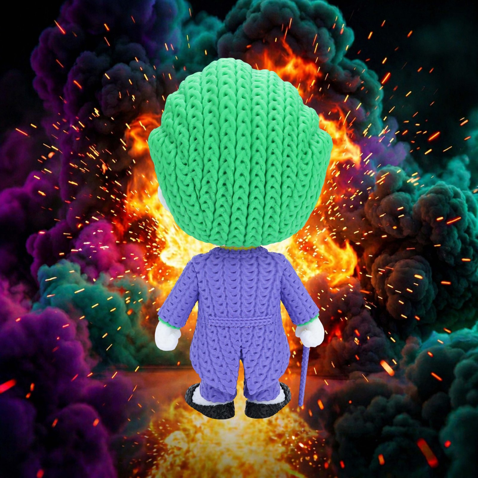 Add a little chaos to your collection with this 8-inch 3D printed Joker figure featuring a unique knitted/crochet-style texture. With a swivel head for adjustable posing, it’s a bold and eye-catching display piece for any comic fan.